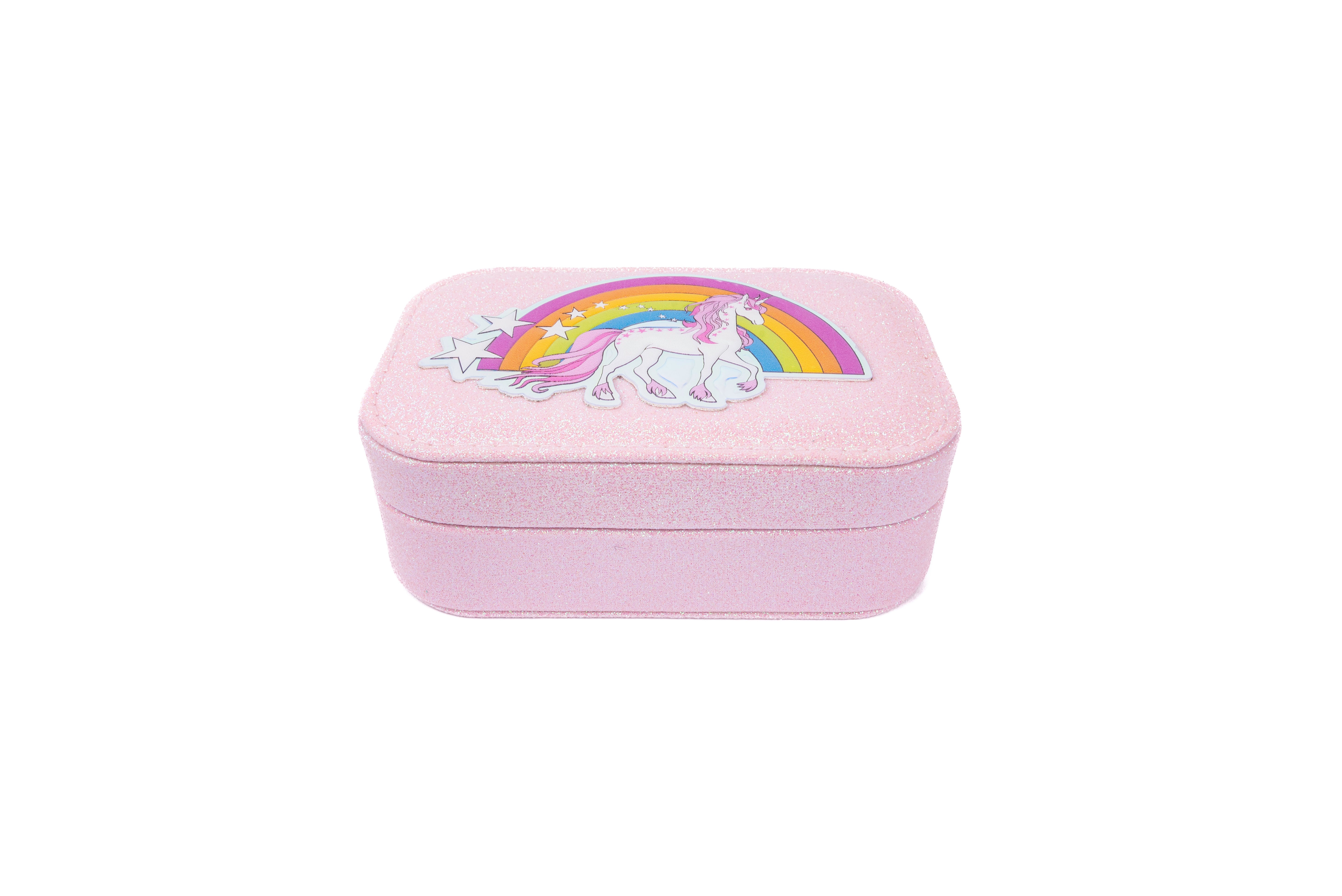 Keep your treasures safe in magical style with our Pretty Precious Unicorn Jewelry Box in pink. Covered in glittery pink sparkle and topped with a whimsical unicorn and rainbow design, this jewelry box is the perfect place to store all your favourite accessories.